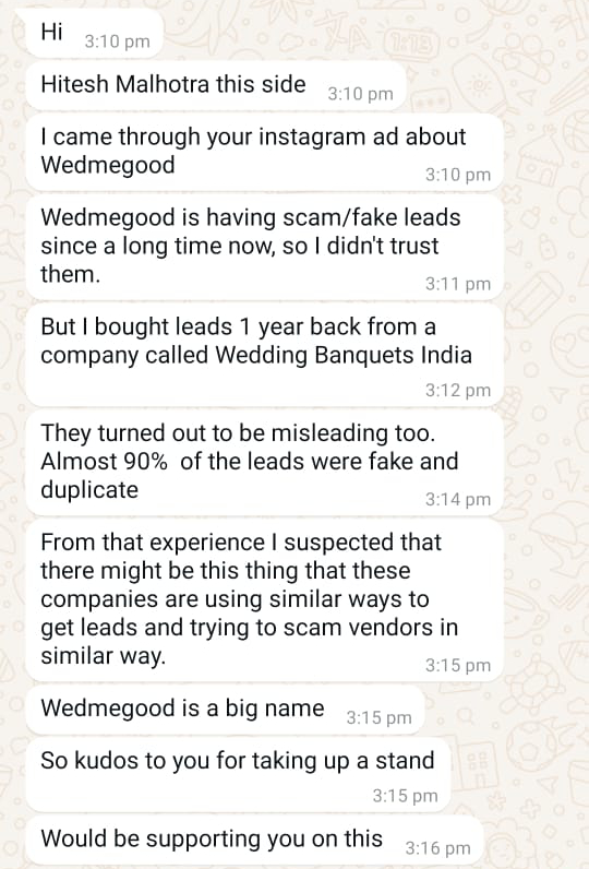 For vendors like the founder of True Shades Photography, who presented us with extensive records, the situation is clear: the return on investment simply doesn’t add up and despite conversation with WedMeGood CEO–no refund has been made on his request.