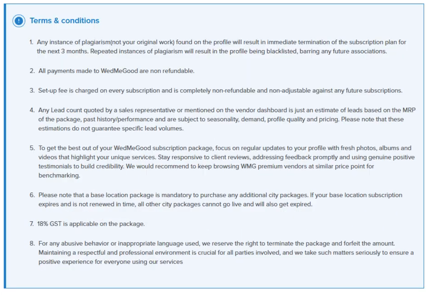 While sales teams allegedly use words like “guaranteed leads”, WedMeGood’s own Terms & Conditions explicitly say the opposite—that lead estimates are not guaranteed, and that performance may vary widely.