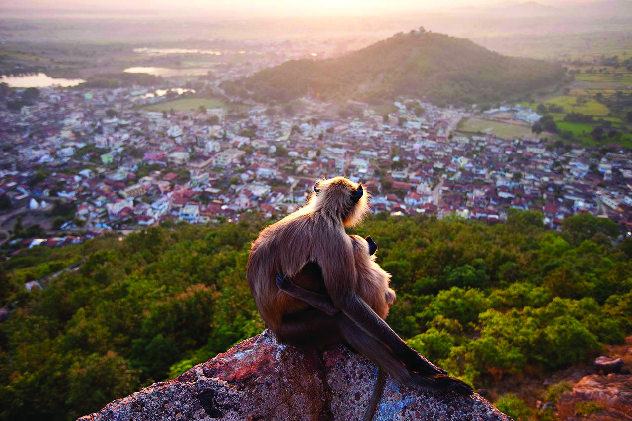 Yet another metaphorical representation of deforestation and habitat destruction, French photographer Olivier Puccia shot this picture of a baby Hanuman langur embracing its mother at a hilltop temple in the town of Ramtek, Maharashtra. The soft, serene sunlight envelopes the sky in warmth and the village below is sunk in a hue of blue, drawing a line between nature and humans’ development.