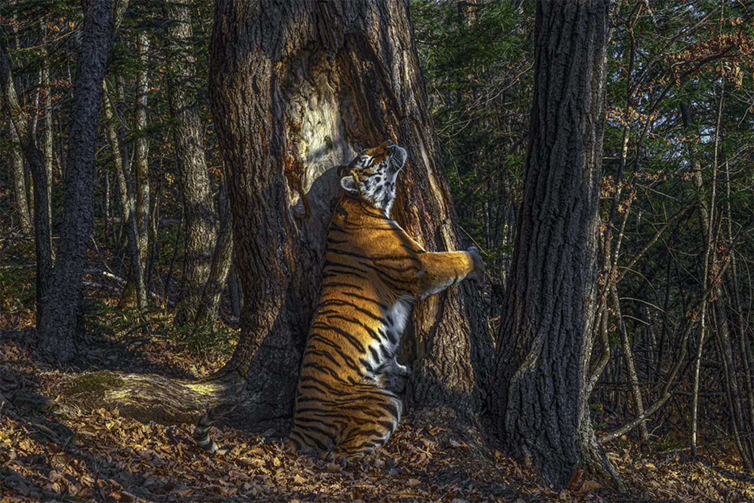Sergey Gorshkov was awarded the Grand Title at the 2020 Wildlife Photographer of the Year competition. Captured in Russia’s Land of the Leopard National Park, the image depicts a female Amur tiger, also known as the Siberian tiger, embracing an ancient Manchurian fir tree. The tiger is scent-marking the tree by rubbing her cheek against its bark, a behaviour that communicates her presence and territorial boundaries to other tigers. Gorshkov employed motion-sensor cameras over a period of 11 months to document this rare and intimate moment. The photograph not only showcases the beauty and majesty of the Amur tiger, but also highlights the challenges faced by this critically endangered species, with only around 500 individuals remaining in the wild. The Embrace serves as a poignant reminder of the delicate balance between wildlife and their habitats, emphasising the importance of conservation efforts to protect these magnificent creatures.