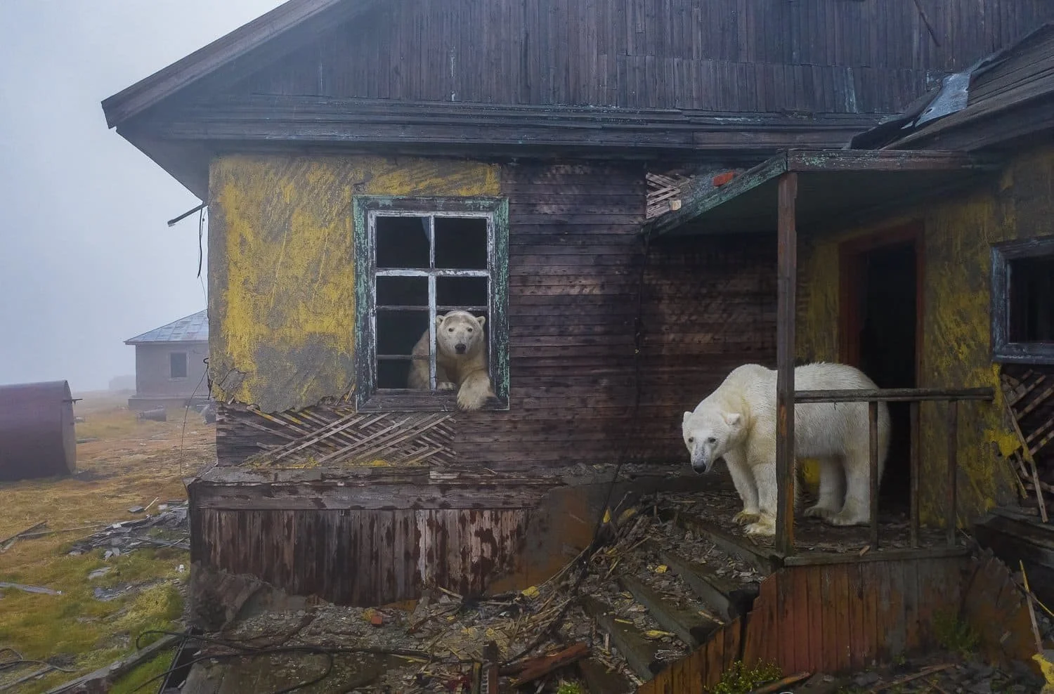 Photographer Dmitry Kokh captures a surreal moment where polar bears have taken refuge in the abandoned structures of a Soviet-era weather station on Kolyuchin Island in the Russian Arctic. Taken during a 2021 expedition, the image shows a polar bear peering out from a broken window, embodying the eerie stillness of a bygone era overtaken by nature’s resilience. The bears’ presence in these human-made ruins highlights the profound impact of climate change, which has forced these normally solitary creatures to adapt to new environments in search of food and shelter. Kokh’s use of a low-noise drone to capture this scene emphasises the delicate balance between human encroachment and wildlife, offering a poignant commentary on the intersection of nature and human history. The photograph has garnered international acclaim, winning top honours at the Nature Photographer of the Year Award and being featured in the Wildlife Photographer of the Year exhibition, underscoring its significance in wildlife conservation discourse.